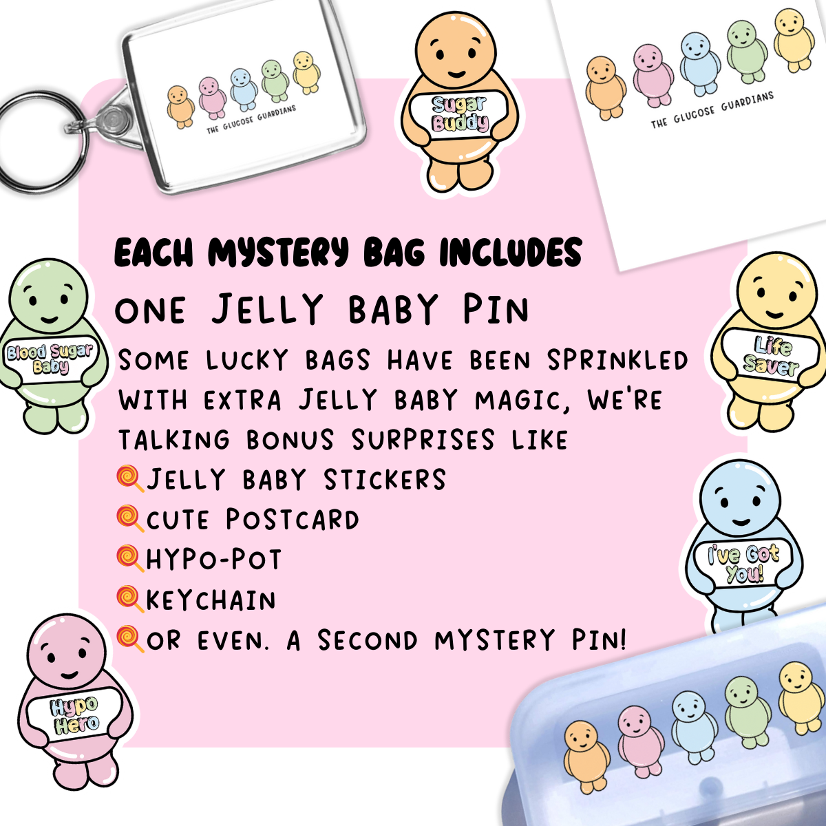 Say hello to your new sweet sidekick, The Glucose Guardians Jelly Baby Mystery Bag! Each bag includes ONE randomly selected Jelly Baby pin badge from our exclusive set of five adorable designs… but that’s not all.