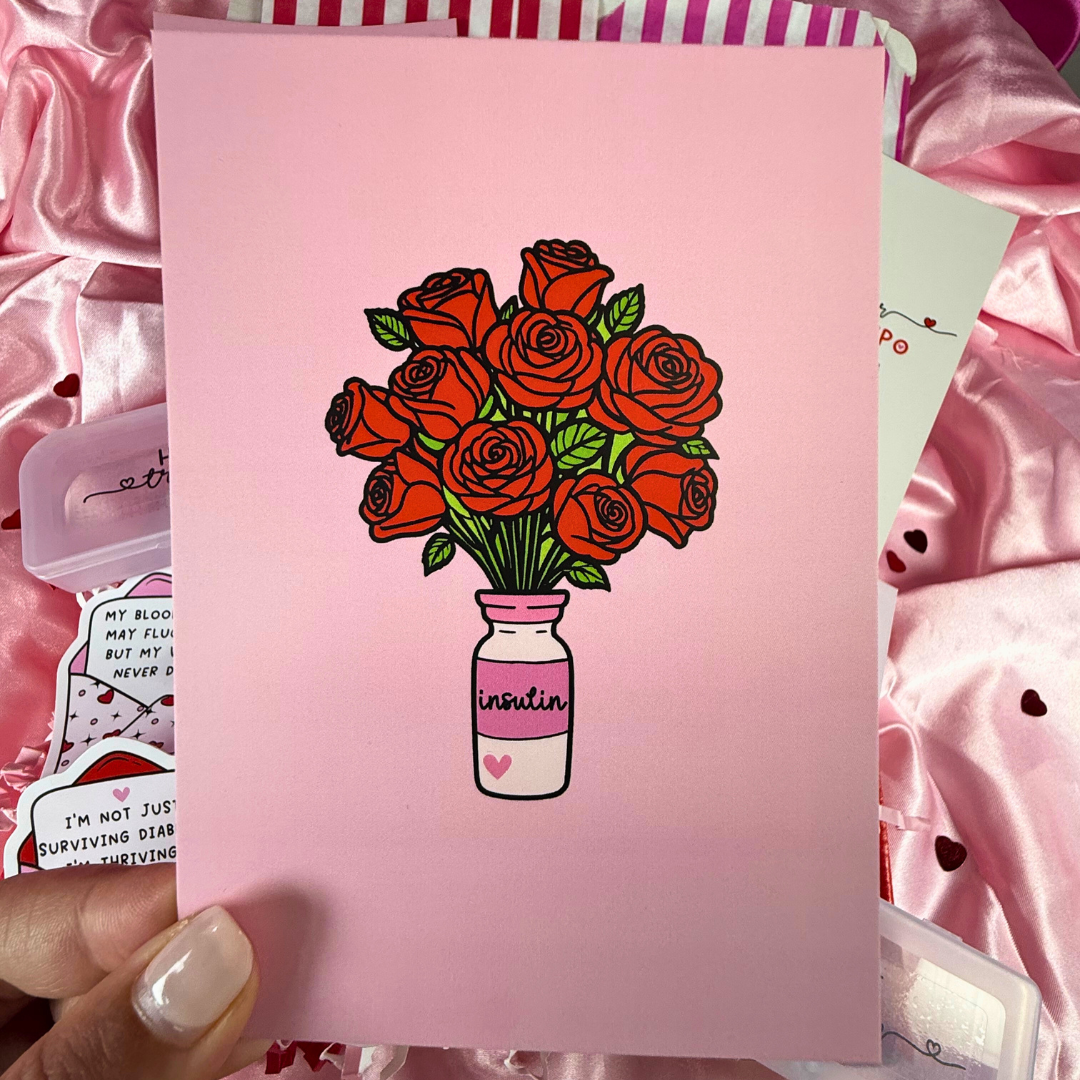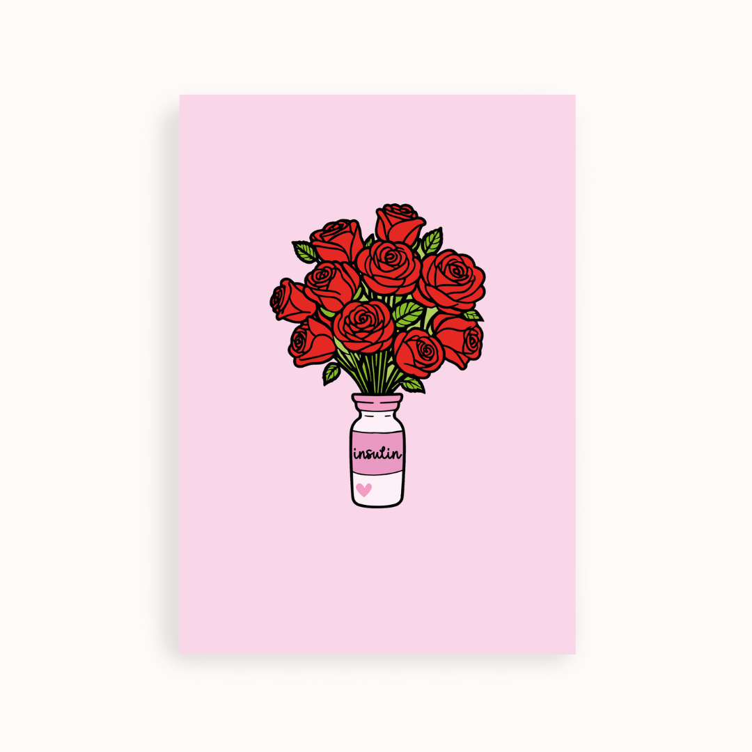A postcard featuring the stunning insulin rose vase design. A unique piece of diabetes-themed art that also works as a thoughtful Valentine’s message.