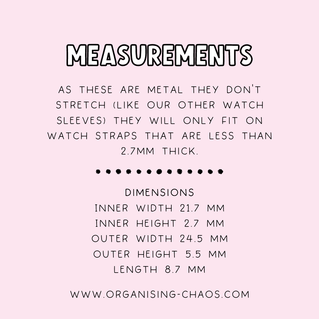 As these are metal they don't stretch (like our other watch sleeves) they will only fit on watch straps that are less than 2.7mm thick.