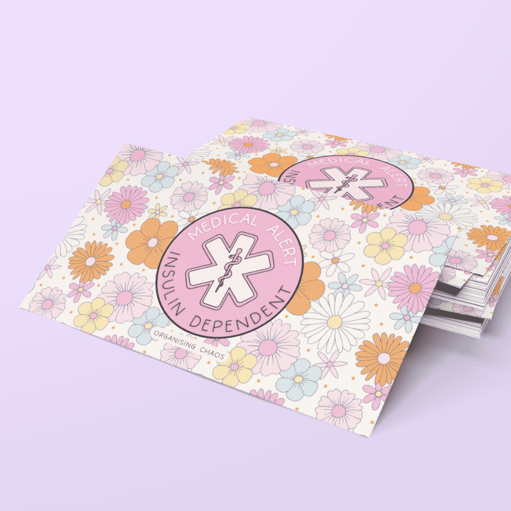Cards are business card size and fit in (most) bag/purse card slots! They will fit perfectly the Organising Chaos diabetic kitbag.
