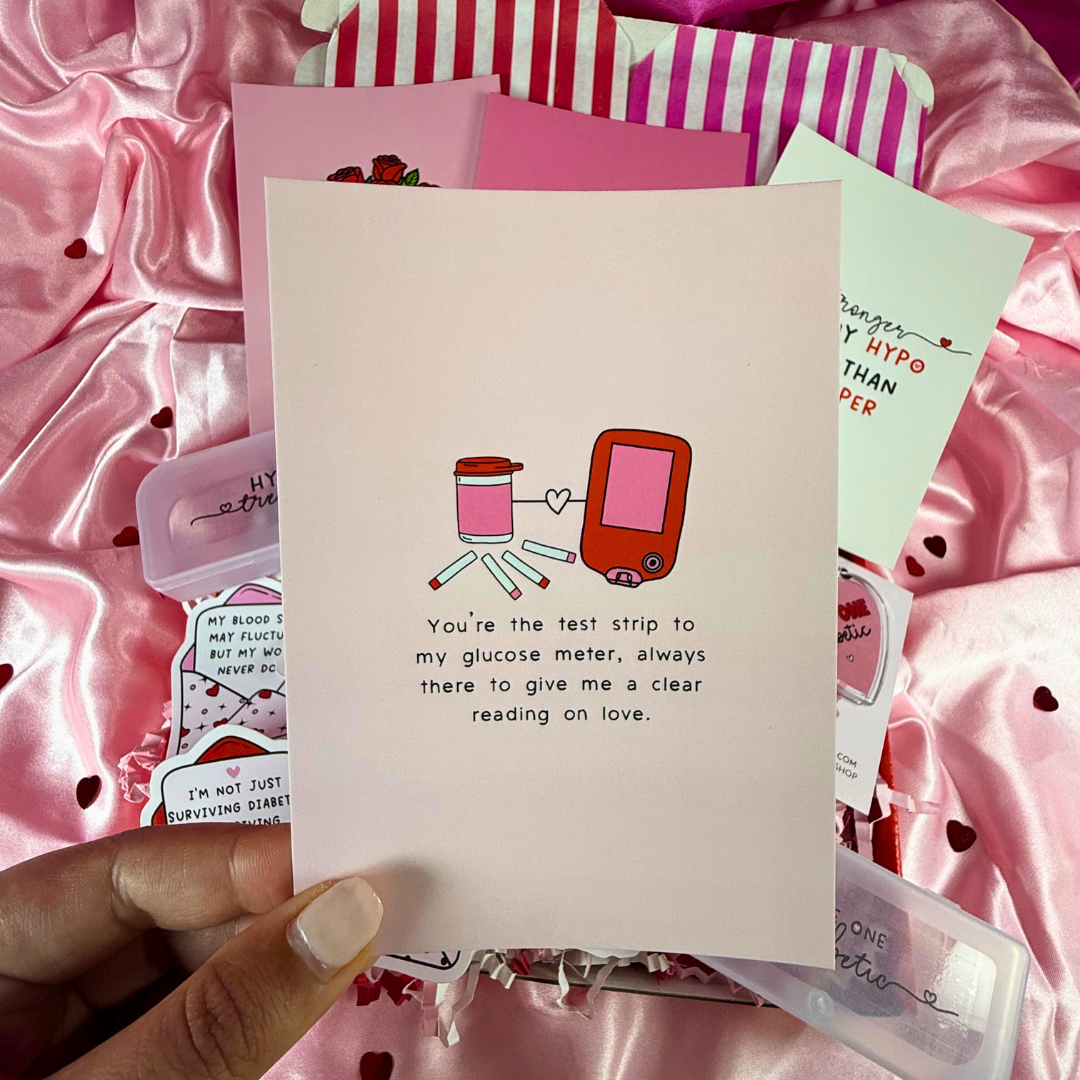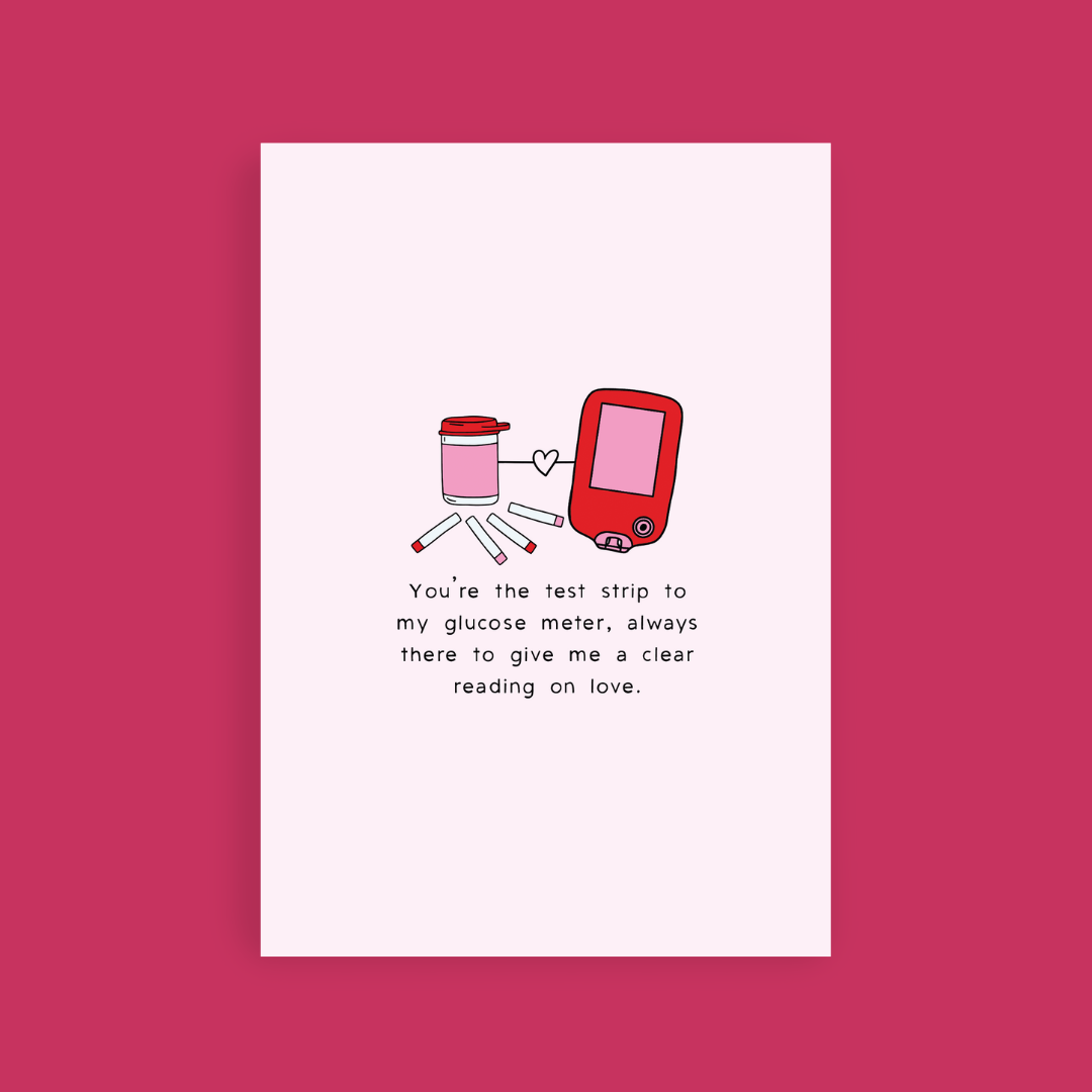 Celebrate love with this unique Valentine’s card that says, "You're the test strip to my glucose meter, always there to give me a clear reading on love." A heartfelt and clever way to let your diabetic someone know they’re your constant source of clarity and connection.